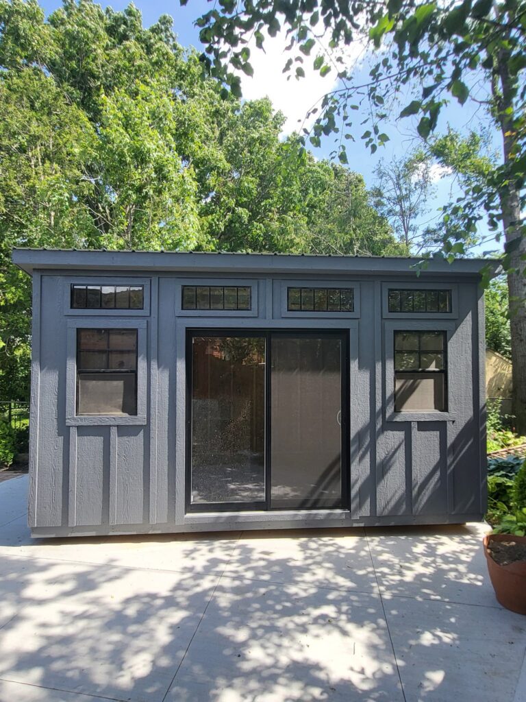 This modern shed has an 8′ tall front wall which gives enough room for a patio door!